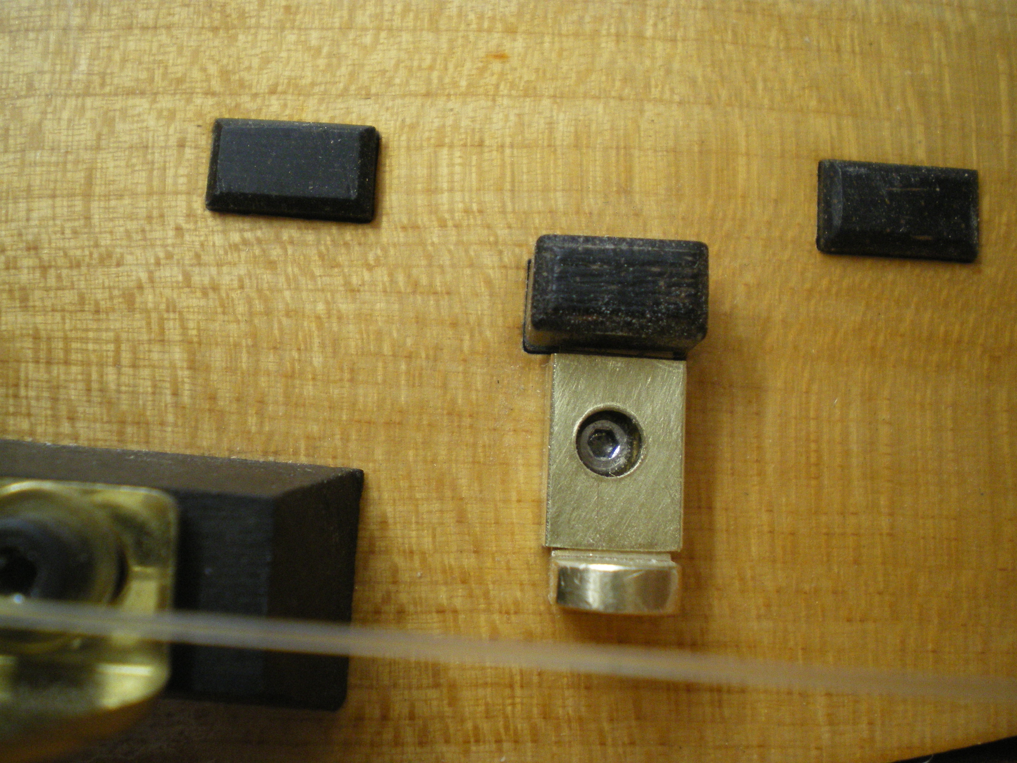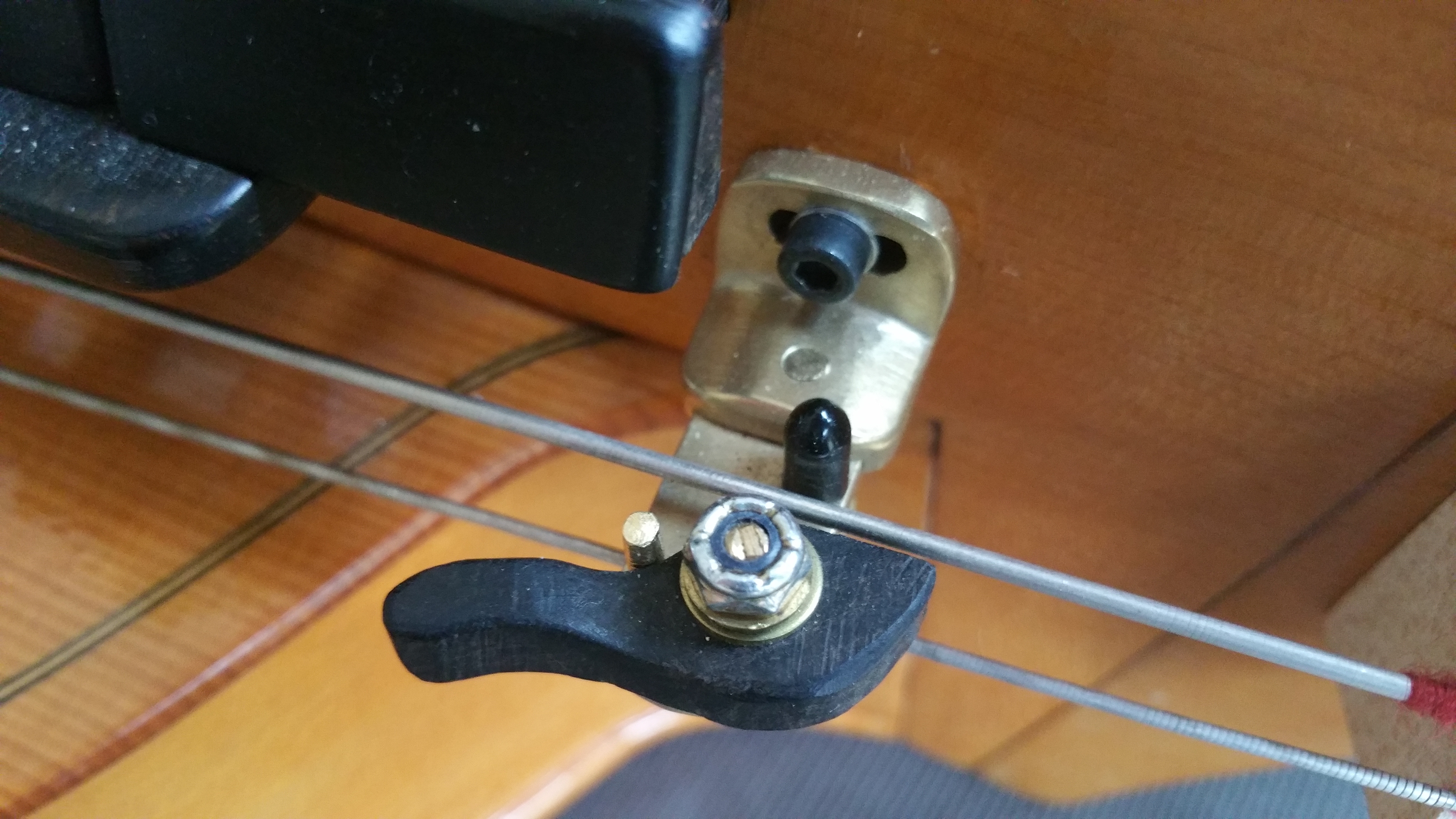 Capos for melody and drone strings. We like Loveland levers. However, it bothers that these capos cannot be attached symmetrically. Here is a symmetrical appearing variant from a combination of those by Wolfgang Weichselbaumer and Loveland.